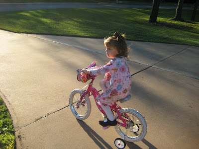 Kate following her daddy and sissy down the sidewalk. I know she isn't wearing her helmet, but we only let her ride to the driveway next door and back.